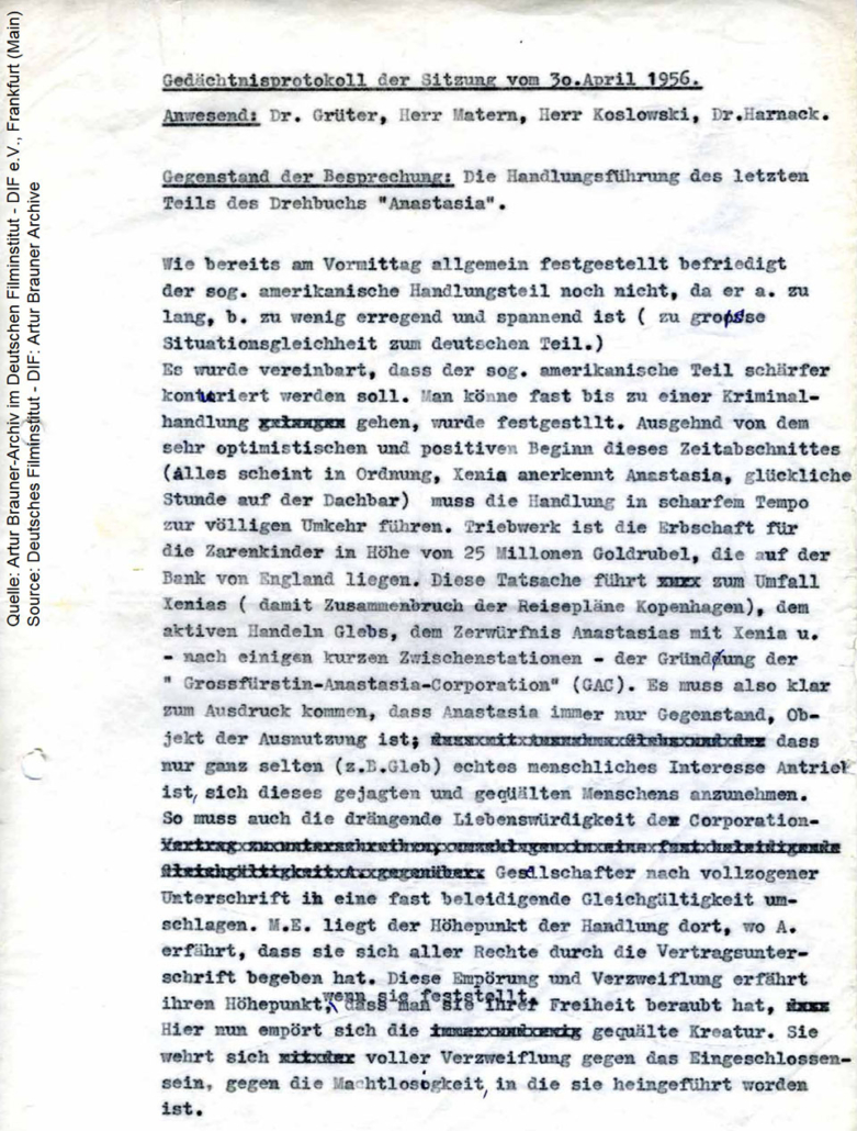 Gedächtnisprotokoll einer Besprechung über die Handlung von „Anastasia, die letzte Zarentochter“, mit handschriftlichen Kommentaren von Artur Brauner.